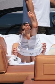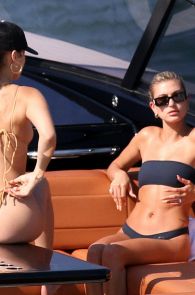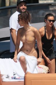Bella Hadid wearing a thong bikini on a yacht in Miami. Bella displayed her insanely hot body while having fun with her friends, including Hailey Baldwin. At one point Bella got wet (either by taking a shower or a swim) which made her bikini top almost invisible, luckily for us. Enjoy the gallery below!