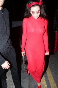This time she is wearing a red see through dress impersonating the hot devil she is, the one on your shoulder pushing you to naughty things… Underneath she taped her nipples with a black X and had a teeny, tinsy thong on. Yeah, that means almost all her goodies were showing in a state of perfection. She must have a pact with the devil, she is that hot… Charli XCX was on her way to an event at Veuve Clicquot Widow Series “ROOMS” in London. She actually started her career singing at illegal warehouse rave parties, aged only 14. Now, ten years later, she is killing it, and our hearts! I bet she stars in some of your evilest dreams…