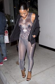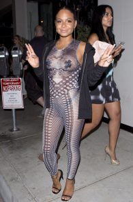 Let’s all wish a big “Happy Birthday!” to Christina Milian! She celebrated her b-day at Catch in West Hollywood in a see thru outfit. The party girl was in a fun mood so she taped her nipples and her tits looked amazing. With such boobs she is one in a Milian! You see what I just did there?! Her printed jumpsuit was beyond see through, her ass was visible from the moon and the black thong was a lovely addition. She has the full package, boobs, tits, and a broad smile.