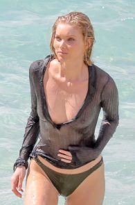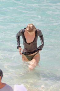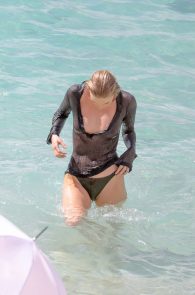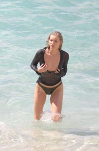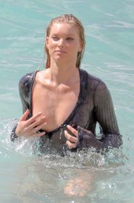 On this occasion, she posed in a grey bikini and a see through blouse. Well see thru is mostly correct, but the blouse is wet with a wide cleavage. You get a good look of the boobs – nipples included. And as she took it on, while she was braless in the sand, we got a pretty clear view of her side boob with a nip slip on top! What could you ask for more?! A blue-eyed, blonde, foreign model with tits showing and all wet…