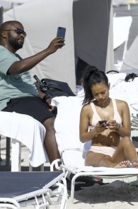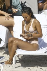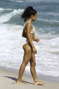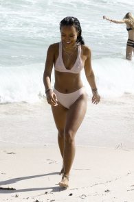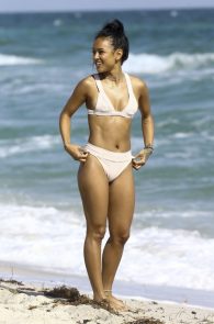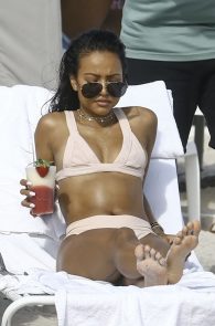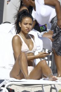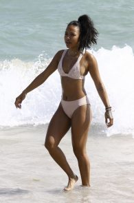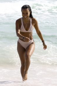 Sweet petite! Let’s get down to business! In a pale pink bikini is Karrueche Tran on the beach in Miami. I have a hard time calling the name of this girl with Vietnamese and Jamaican roots, and it’s a hard time in my crotch area. The model makes me go through the work day ever so happy and horny! With that cute face of hers, and her round booty she keeps grabbing… It’s like she knows where I would keep my hands as well… On that ass! And is it my imagination only or in the first pic there is a shy cameltoe emerging from the water?! Please look at it and confirm before something pops over here!