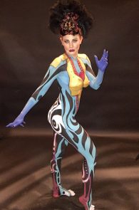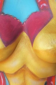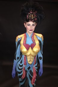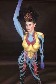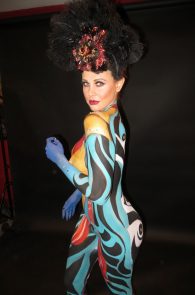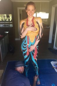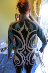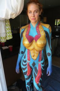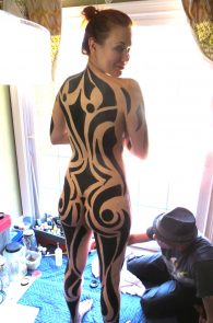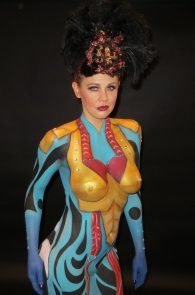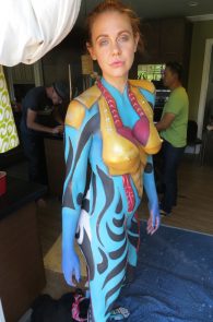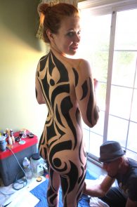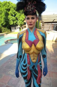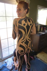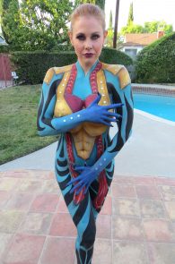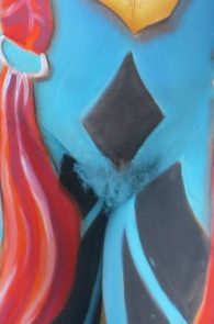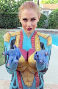 Now THAT is a canvas, my friends! I could paint all day and night that beautiful body! I hope you caught her clear blue eyes before checking out the rest, as it might take a while to look up again! Maitland Ward was a sport showing us the preparations she made for the living art exhibition. Her painted body featured blue skin with black tribal print, a golden plate to shield her breast and, of course, a blue pussy! ;) You can now stare long and strong at those big bazookas and thoroughly enjoy a piece of art, but the colorful surprise is this time her bushy pussy left unprotected from hungry eyes… What did I tell you to look first at her pretty smile?! She is enjoying herself as much as we do her!